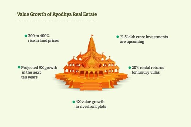 The price premium for plots located near the Ram Mandir and The Sarayu riverfront has increased in value by 4X.
